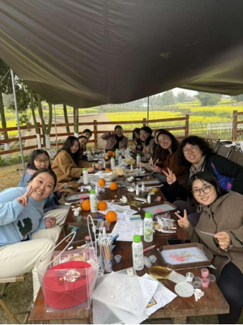 中午时分,大家在田园风铃坡露营营地共进午餐,在轻松愉快的氛围中增进情谊。下午,在专业老师的指导下,大家亲身体验国家级非物质文化遗产“冷珐琅”工艺,亲手制作掐丝茶盘,感受传统技艺的独特魅力。随后,员工们参观了广都博物馆,深入了解双流近10万年的历史文化脉络,或漫步于350亩油菜花海,欣赏汉唐风格建筑与春日田园风光,沉浸于自然与人文的交融之中。